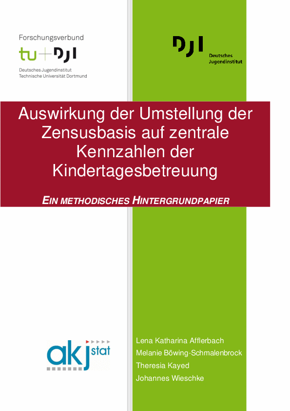 Afflerbach, Lena Katharina/Böwing-Schmalenbrock, Melanie/Kayed, Theresia/Wieschke, Johannes (2026): Auswirkungen der Umstellung der Zensusbasis auf zentrale Kennzahlen der Kindertagesbetreuung – Ein methodisches Hintergrundpapier. Dortmund: Eigenverlag Forschungsverbund DJI/TU Dortmund.