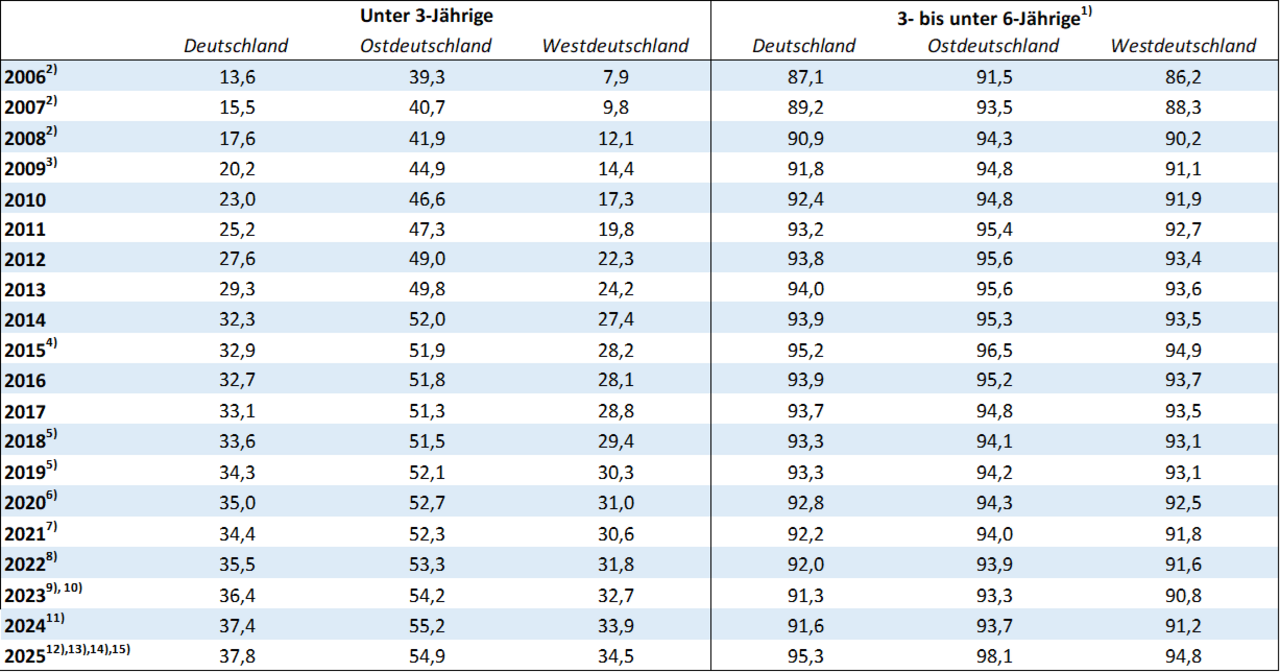 Die AKJStat stellt die Beteiligungsquoten nach Altersjahren sowie differenziert nach Altersgruppen jährlich für Deutschland, Ost- und Westdeutschland sowie für alle Länder zur Verfügung. Üblicherweise wird sie für unter 3-Jährige und für 3- bis unter 6-Jährige ausgewiesen. 6-Jährige bleiben in der Berechnung der Quote unberücksichtigt, da diese zum Teil bereits die Schule besuchen und eine Einbeziehung daher mit Unsicherheiten verbunden wäre (vgl. hierzu ausführlich Detemple/Meiner-Teubner/Olszenka 2021).